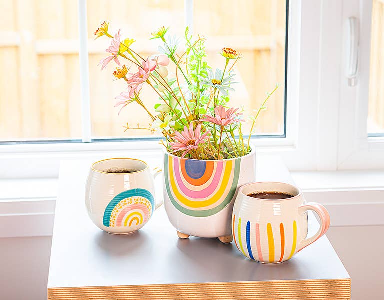 Add some colourful artistic flair to your favourite plant or blooms with this Large Rainbow Planter with Legs. Crafted out of stoneware, this raised ivory planter is accented with a uniquely coloured Expressionist rainbow that makes an elegant complement to any plant or flowers.