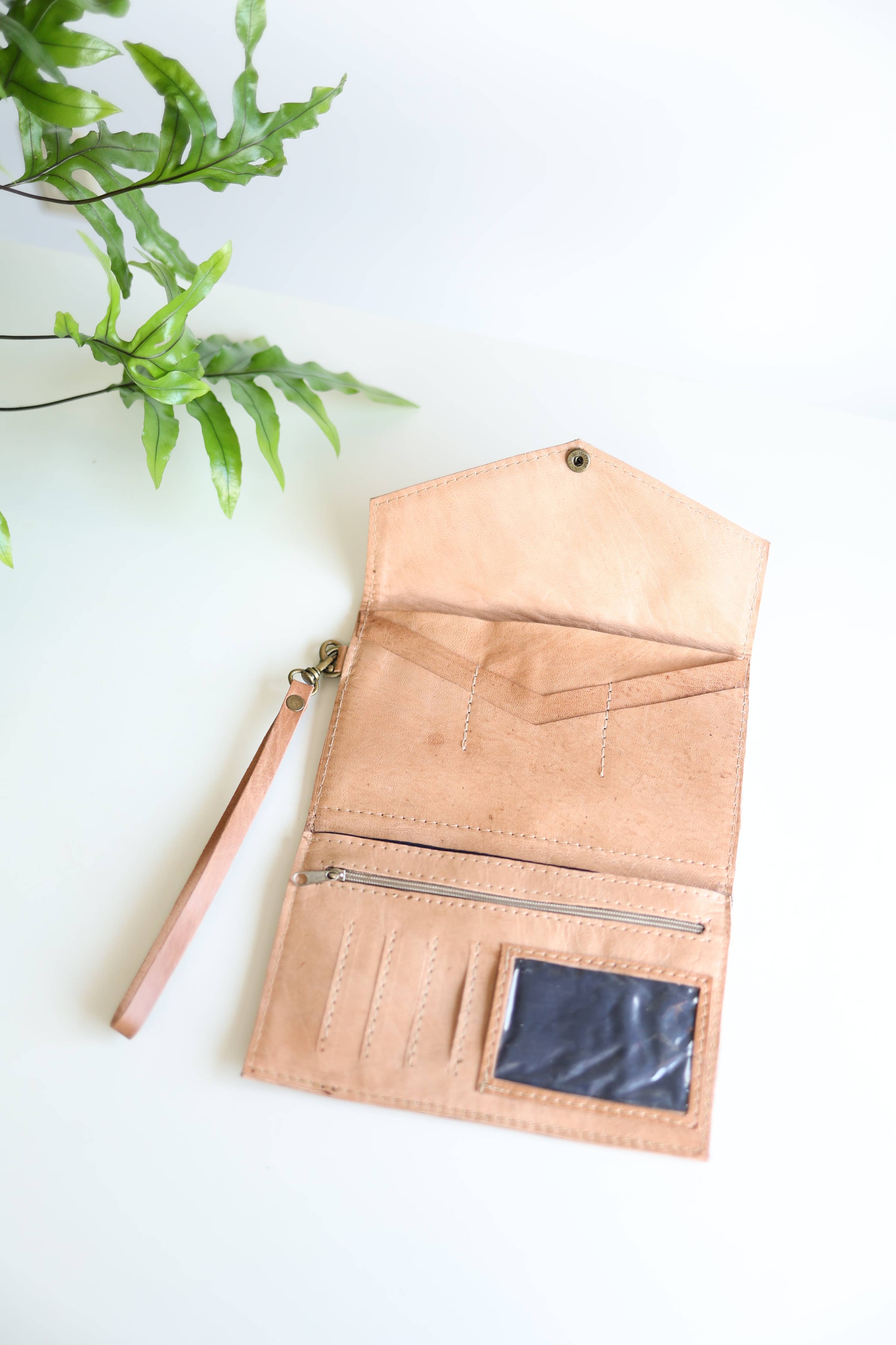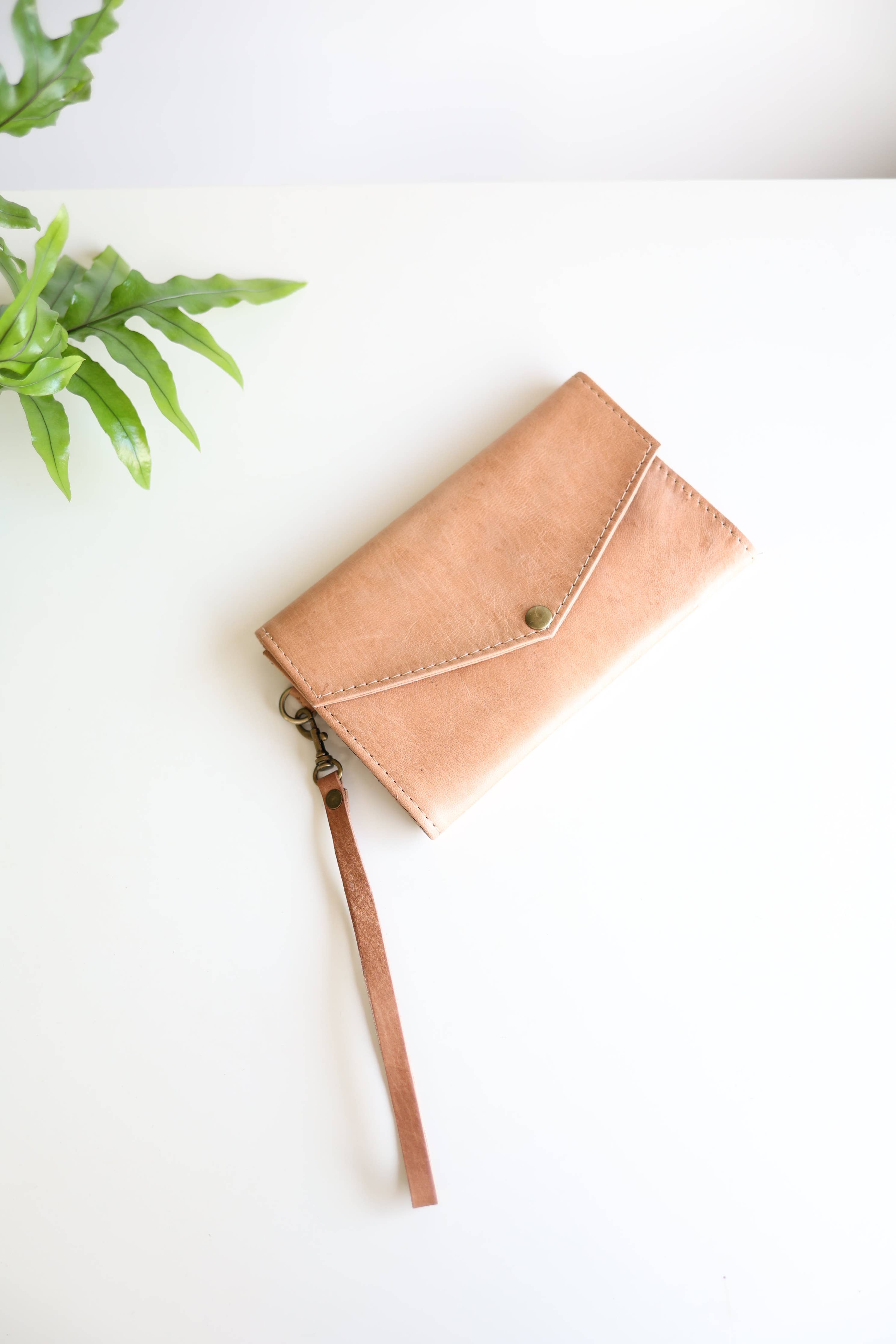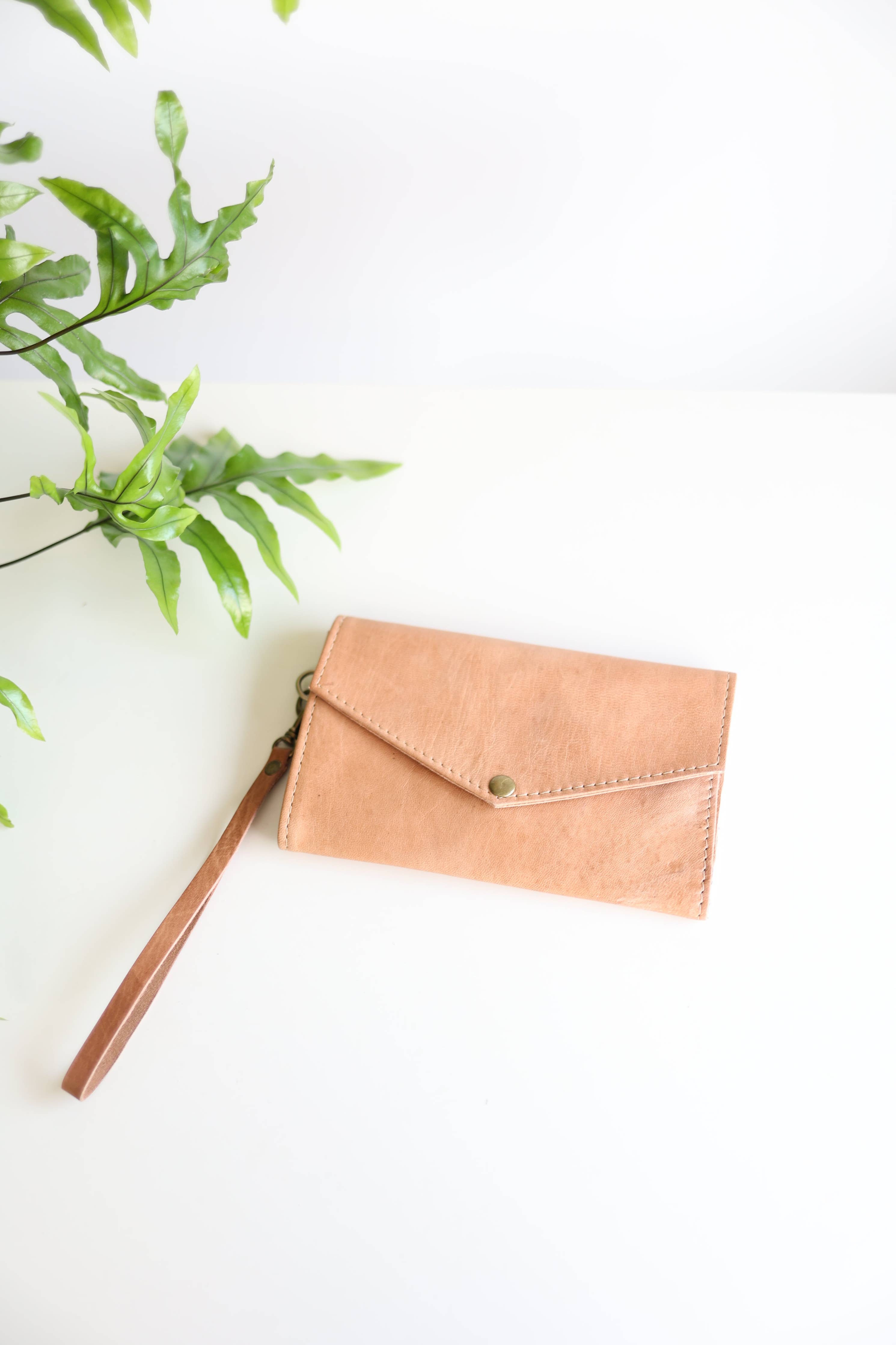 Features a brass snap, a leather wristlet for carrying and interior zipper.