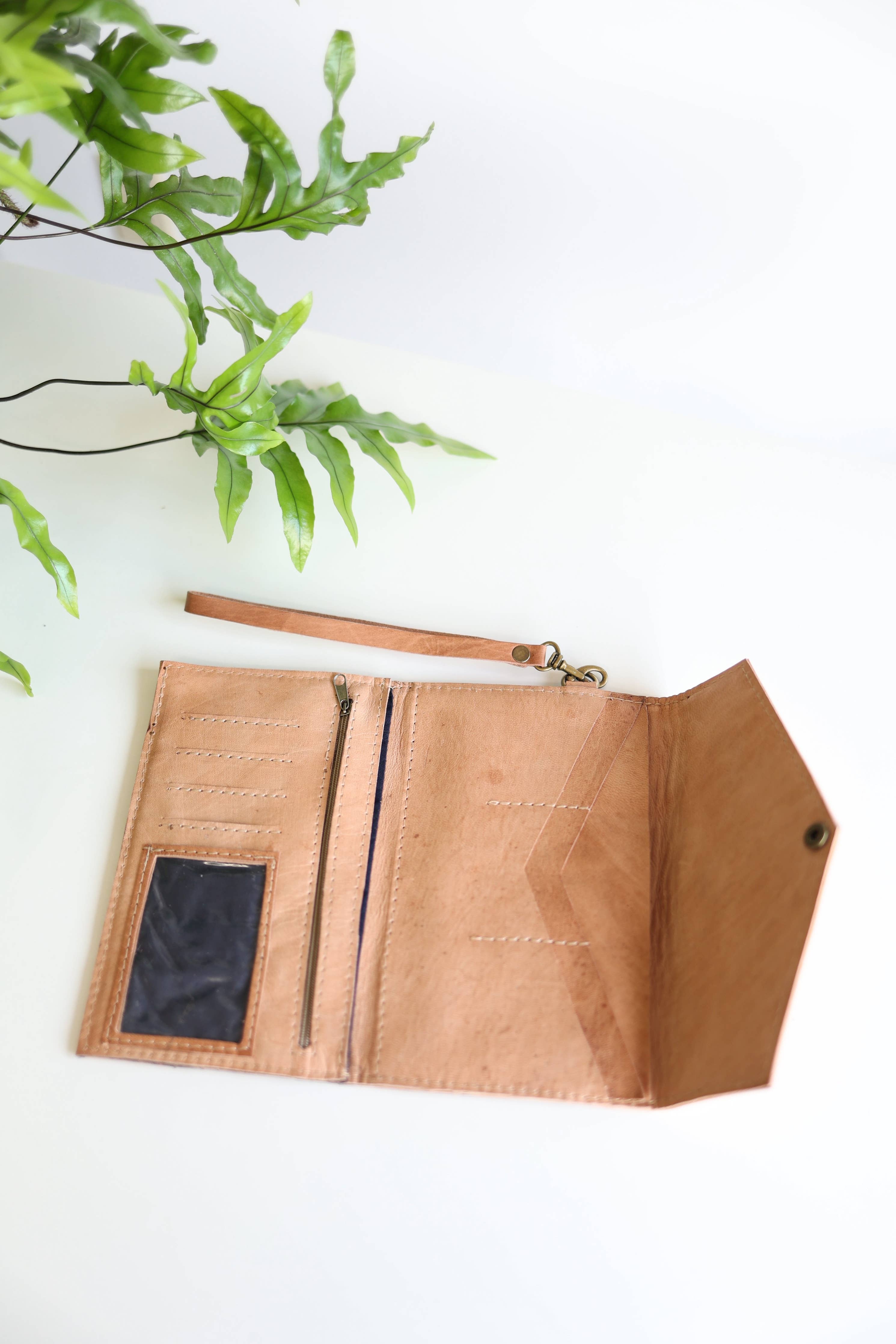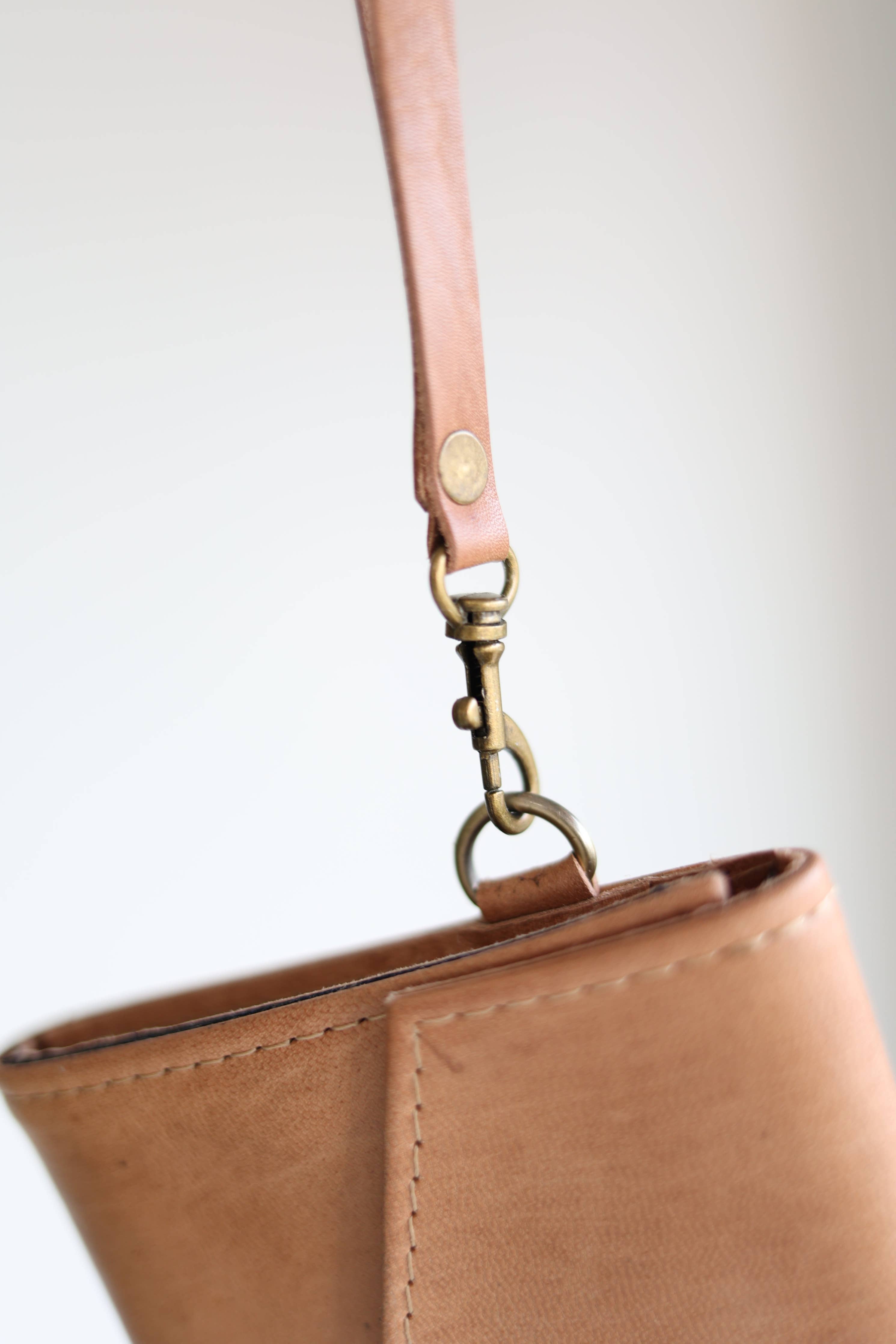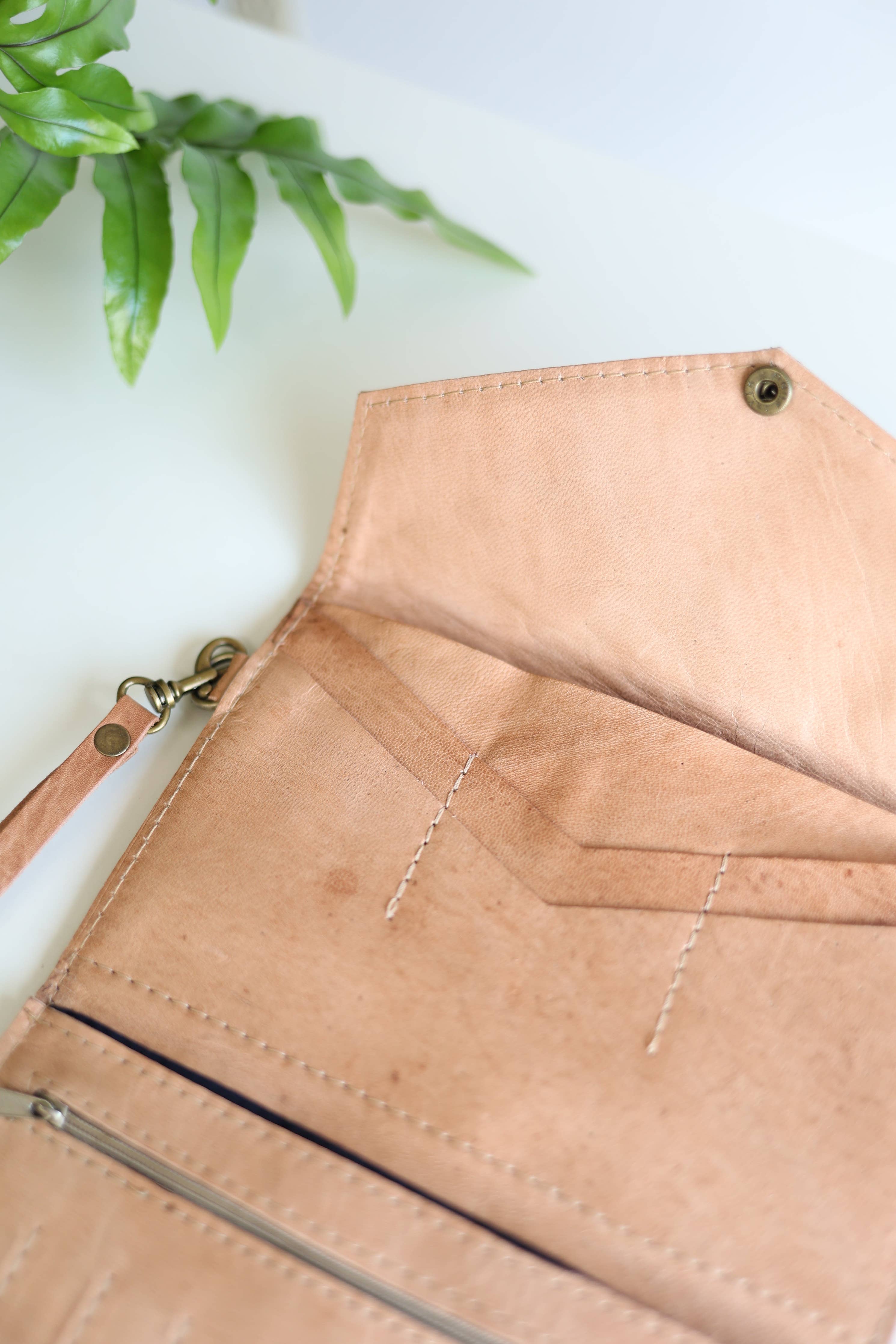 Features a brass snap, a leather wristlet for carrying and interior zipper.