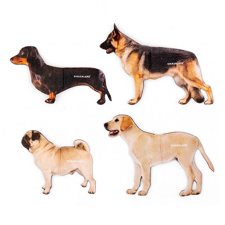Get your page to stay with our well-trained magnetic doggies. Set of 4 magnetic bookmarks, includes a Dachshund, German shepherd, Pug and a Labrador retriever. ; Design: WITH creative ; Material: paper, rubber magnet ; Packaging: card ; Prod. Dim.: 2" x 2.5" x .25" ; Pkg. Dim.: 6.5" x 4" x .25" ; Display Dim.: n/a