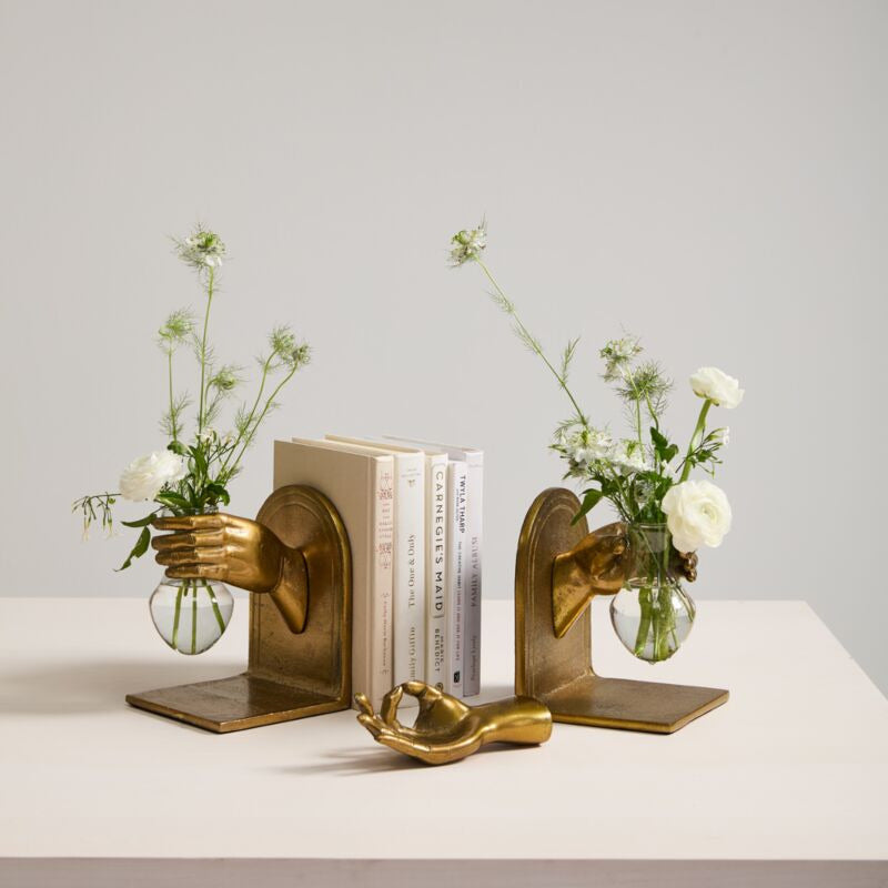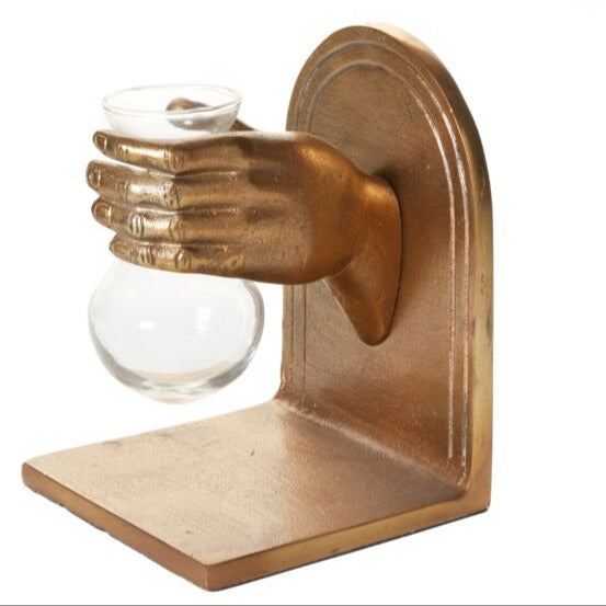We all need a hand to hold, but especially one designed to hold a bundle of flowers & books. The recycled cast aluminum in an antique gold finish features a playful design & sculpture quality. This indoor planter can stand alone, or pair with a second bookend for an attractive bookshelf display.