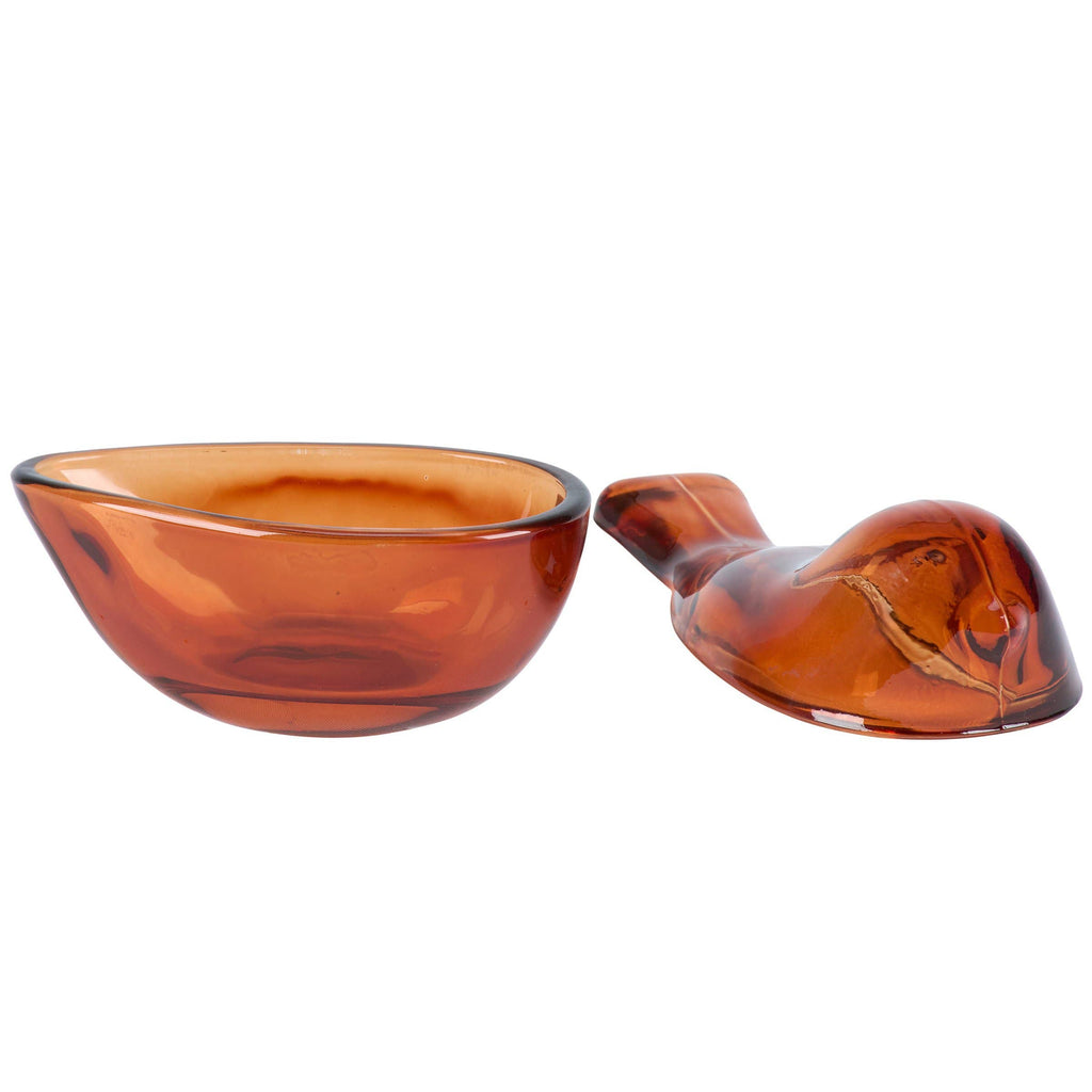 A decorative jar from our Jewel Tone Fall Collection displaying a sculpted bird design made with a golden brown glass. The top half of the bird opens to store items inside. Our Golden Bird glass jar is a vintage fall home accent perfect for seasonal display. Dimensions: 2.3" x 4.8" 2.5".
