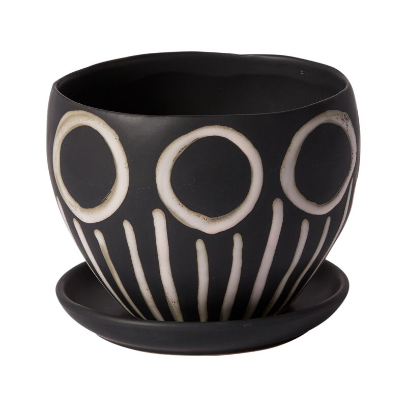 The Hootie Hoo Pot is bowl shaped with a contrasting hand drawn line and circle pattern. Complete with a drainage hole and saucer, it is a versatile container for any plant.