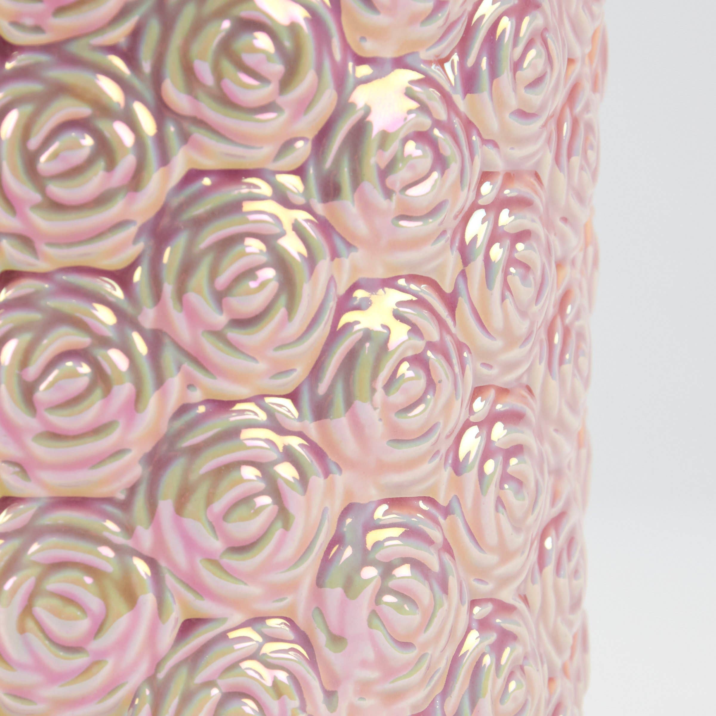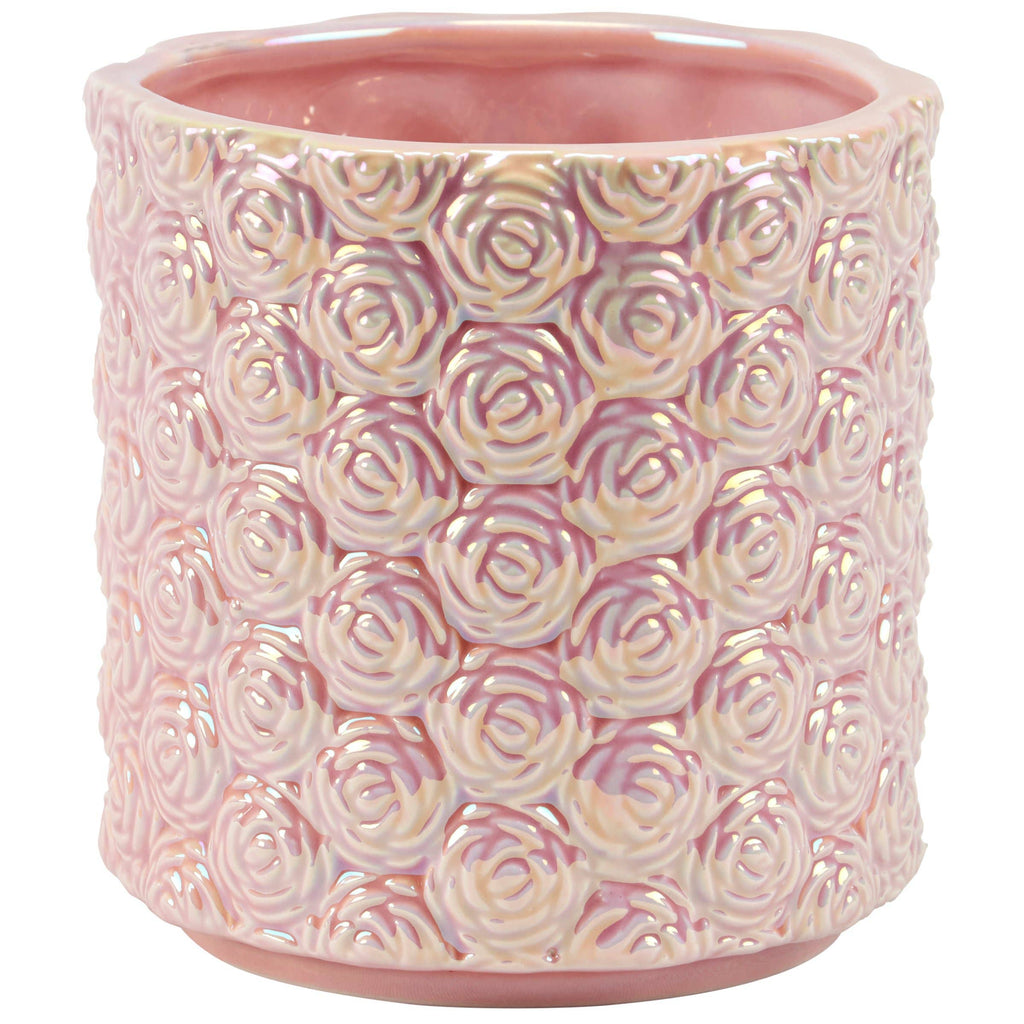 A ceramic planter/vase displaying a sculpted roses design around the outside with a pink iridescent glaze finish throughout for added interest. Our Pink Roses planter features opening on top to place greenery. Greenery pictured not included. Fits 4" nursery pot.